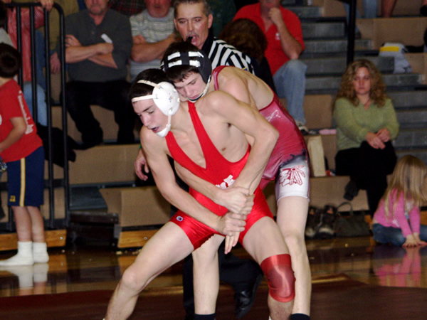 Zac Baumgartner tries to escape the grip of last year's District 10 champ, Matt Laird.